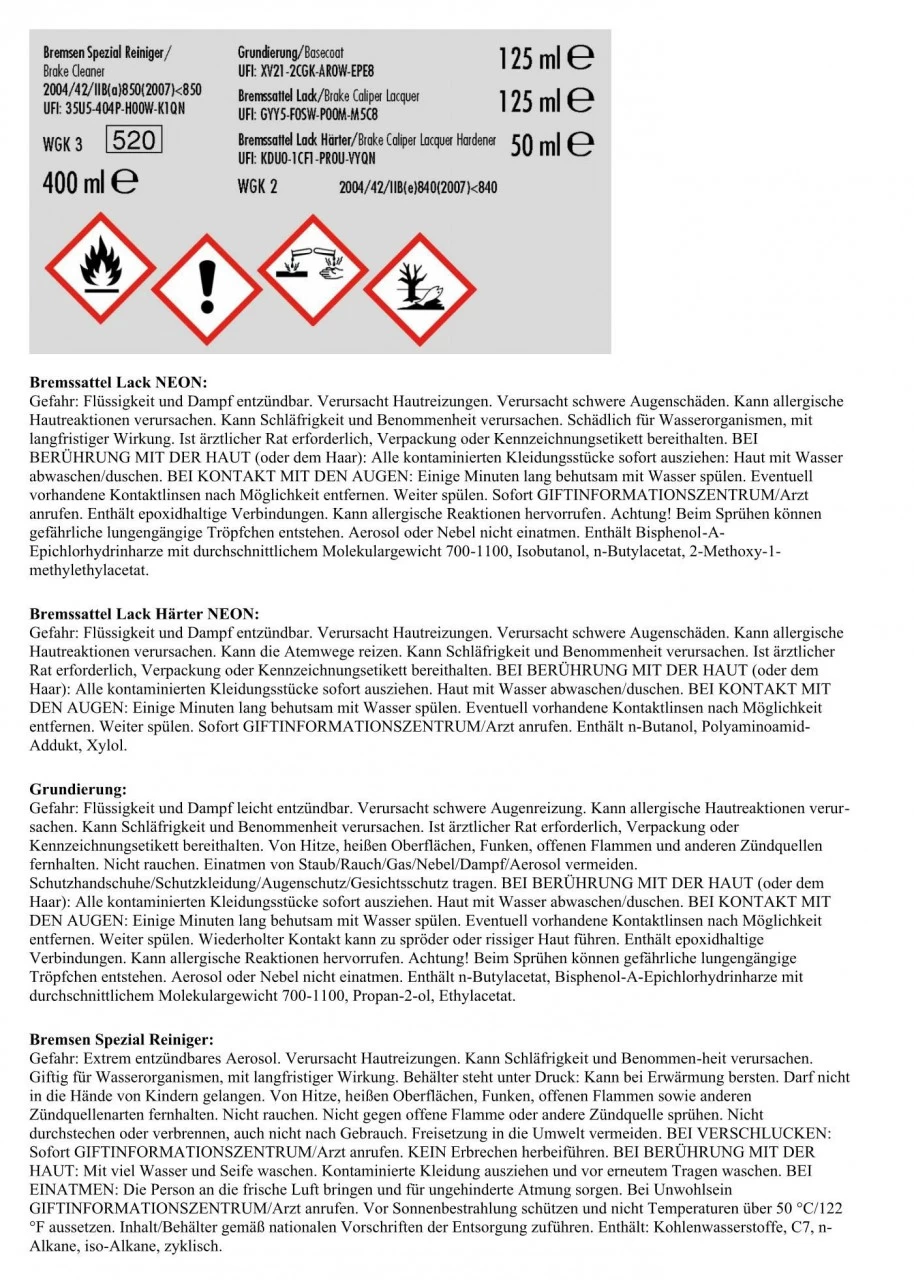 - Set bestehend aus: Bremssattellack 125g, Bremsen-Reiniger 400ml, Grundierung 125 ml, Lackhärter 50g