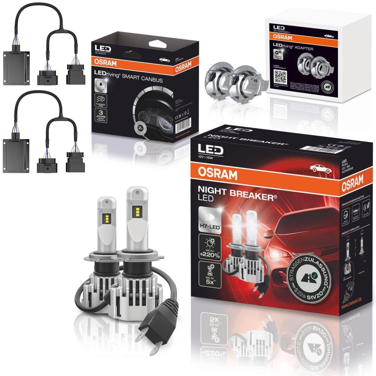 Gehen Sie zur Kompatibilitätsliste und prüfen Sie, ob Ihr Fahrzeug aufgeführt ist. Vergleichen Sie die Scheinwerfer-Genehmigungsnummer in der Liste mit der auf den Scheinwerfern Ihres Autos. Sie startet mit einem „E“ und einer oder zwei Ziffer(n) in einem Kreis und setzt sich dann mit einer 4- bzw. 5-stelligen Ziffernfolge fort. Ob Sie zum Einbau die LEDriving ADAPTER oder/und zwei LEDriving CANBUS benötigen, erfahren Sie ebenfalls in der Fahrzeugliste. Achtung: Nur die Kombination aus OSRAM NIGHT BREAKER LED Lampen in Verbindung mit dem offiziellen OSRAM Zubehör – LEDriving ADAPTER und LEDriving SMART CANBUS (wo vorgeschrieben) – ist zugelassen.